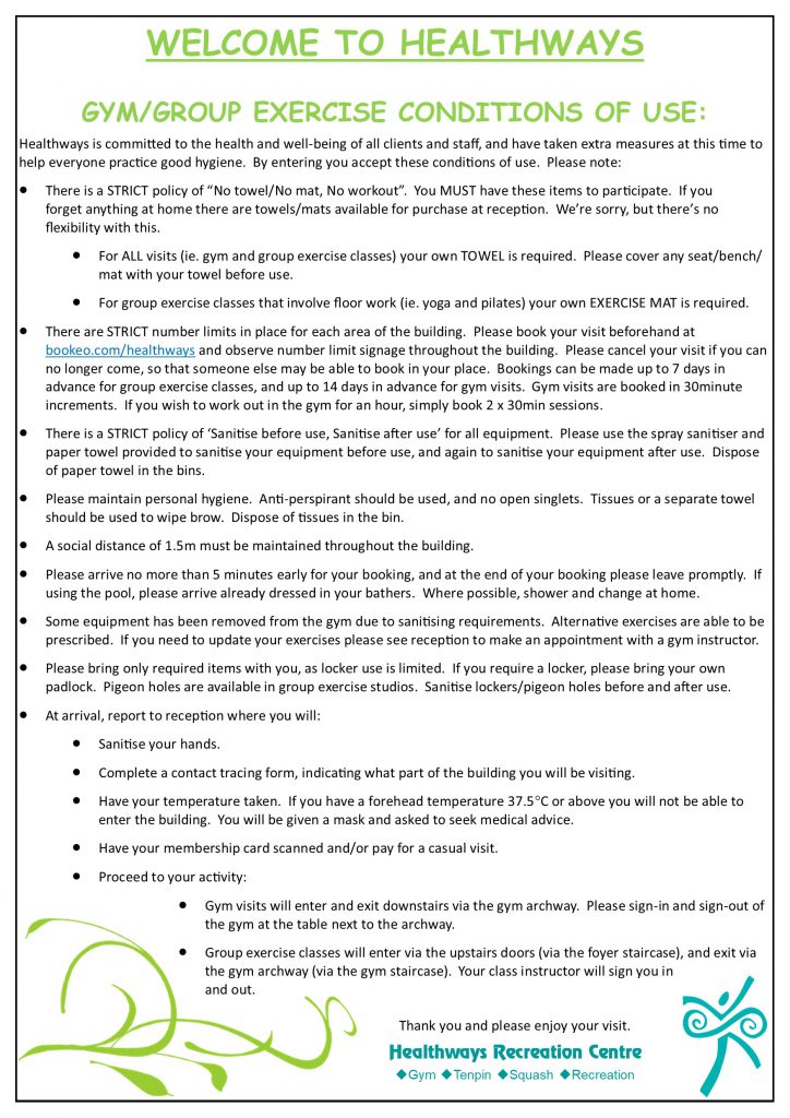 The following conditions of entry will need to be followed STRICTLY so as to comply with government regulations. For example, please understand that we cannot be flexible if you forget your towel. The rule that needs to be followed is “no towel, no workout”. With some practice we hope you will adjust to new habits and remember your towel for a group exercise class as you would remember your towel for the pool. In the meantime, we do have towels/mats available for purchase at the centre for your convenience.